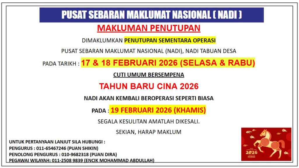 Utama > Maklumat Komuniti > 📢Makluman Notis Penutupan Sementara: Tahun Baru Cina 2026🎉 📢Makluman Notis Penutupan Sementara: Tahun Baru Cina 2026🎉 17 Februari 2026 | Selasa